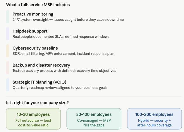 This is where a lot of buyers get confused, because provider offerings vary widely. Here’s what a legitimate, full-service outsourced IT support relationship should include: